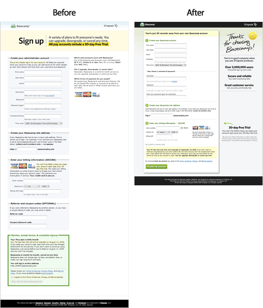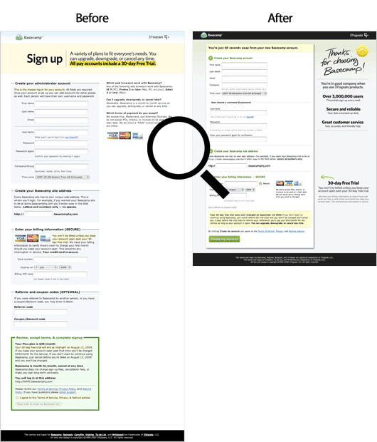 The first step towards designing a successful field is to question it's existence: is it absolutely necessary to have the field and if yes then can it be made optional? In the image on the right, this principle is evident in comparison of Basecamp's new and old sign up forms. The new design has fewer fields.